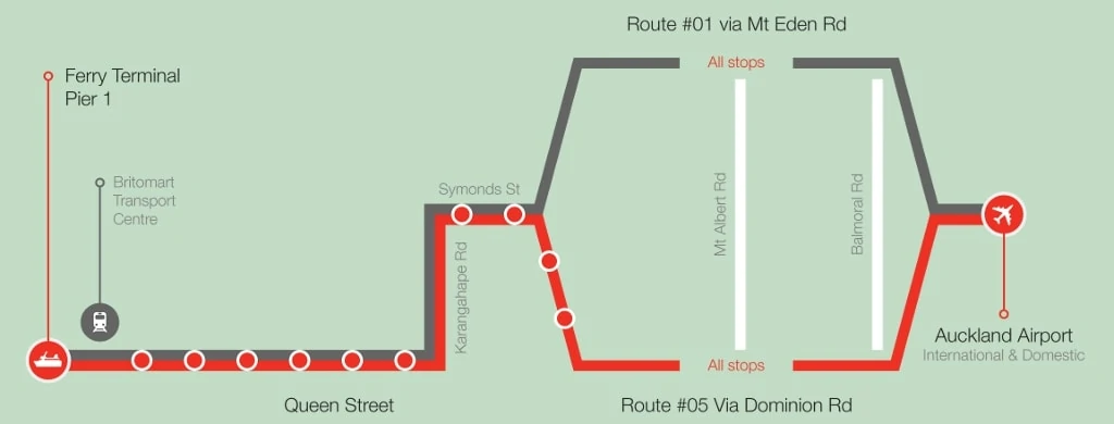 - Busdienst die 24 uur per dag, 7 dagen per week rijdt tussen het vliegveld van Auckland en de stad (net zoals Airbus Express).