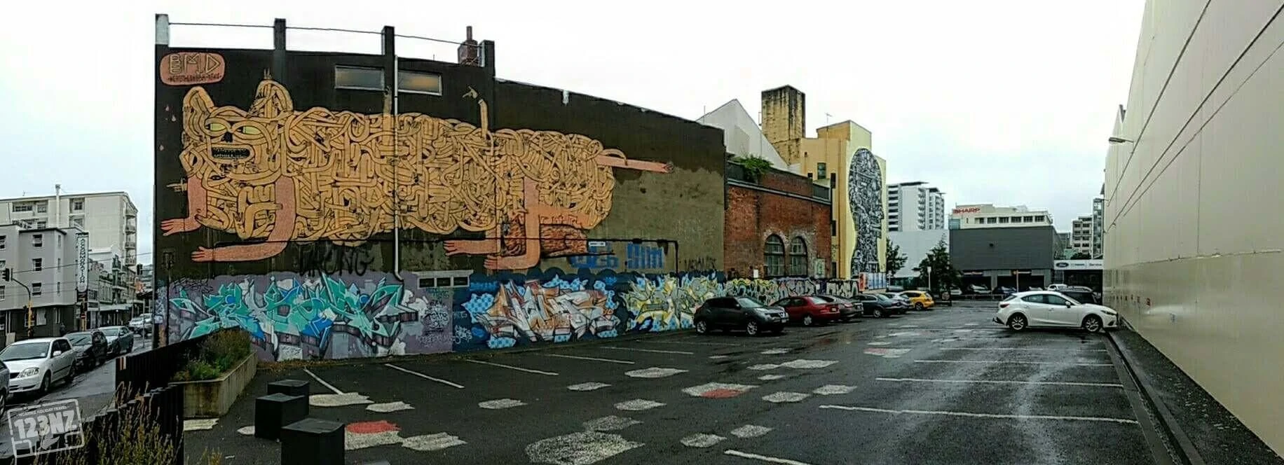 Als je eenmaal een beetje bekend begint te worden in Wellington, kun je van de gebaande paden af. Pak eens een andere route naar je bestemming. Sla eens een andere straat in, loop eens anders. Het is wellicht niet zo flashy als de hoofdstraat, maar je ziet tenminste leuke, aparte, interessante gebouwen en vooral heel divers ‘street art'. Of ‘urban art', als je de kunst van graffiti liever zo noemt.