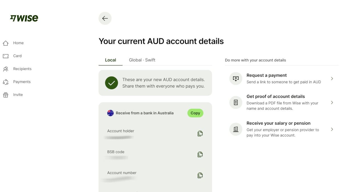Geef de Australische bankrekening gegevens door aan je Australische werkgever en je ontvangt je Australische loon op je AUD-bankrekening. Mocht je werkgever een verklaring willen zien dat deze bankrekening van jou is en op je naam staat, dan kun je dat ook via Wise regelen. Zie het screenshot hieronder dan zie je die optie staan: “Get proof of account details. This is a document stating that this AUD balance is registered to your Wise account.”